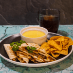 Serve: Cut the quesadilla into wedges. Enjoy with sour cream (if using), queso with chips, and fruit punch (over ice if desired).
