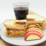 Place the eggs on the bread, cut in half and serve with sliced apple.