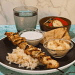 Grill the chicken on all sides, basting with the marinade throughout cooking. Cook to an internal temperature of 160°F (70°C) using a thermometer. While the skewers are cooking, prep the tzatziki.