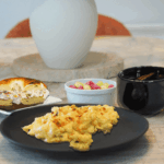 Serve: Plate the chili oil scrambled eggs with the bagel and fresh fruit. Serve with hot spiced apple cider. Enjoy!