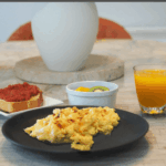 Serve pan con tomate alongside chili oil scrambled eggs, fruit bowl, and orange juice.