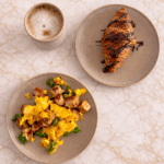 In a bowl, whisk the eggs with salt and black pepper. Pour the eggs into the skillet and cook, stirring gently, until the eggs are just set and fluffy. Remove from heat.