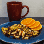 To serve: Drizzle the crêpes chocolate syrup, serve with orange slices and coffee (with milk and sugar if desired).