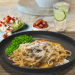 Serve chorizo carbonara with peas, salad, cucumber water, and dates for dessert.