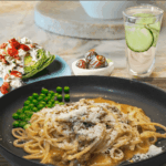 Serve chorizo carbonara with peas, salad, cucumber water, and dates for dessert.