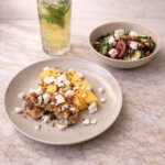 Serve chicken and potatoes with greek salad, and lemon chia fresca.