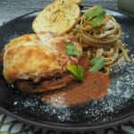Bake in the oven until the cheese is melted and golden brown. Let sit for 5 minutes before cutting into portions. Add more sauce if desired. Garnish with parmesan cheese. Serve with bread.