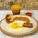 Serve the eggs with sausage, hash browns with ketchup, toast, and orange juice.