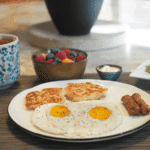 Assemble plates: Serve the potato pancakes with eggs, sausage, avocado slices with lime, fresh fruit, and hot apple cider.