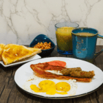 Serve the eggs with bacon, sausage, baked beans, grilled tomato, toast, orange juice, and coffee.