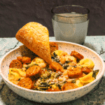 Serve with sliced sausage and bread. Garnish with parmesan cheese and red pepper flakes.