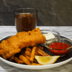 Serve the fish with tartar sauce, lemon wedge, french fries, ketchup, and iced tea.