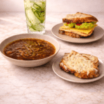 Serve the soup topped with melted Gruyère crostini, alongside turkey and cheese sandwich and cucumber water.