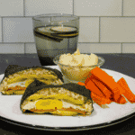 Serve egg gimbap with carrots, hummus, and cucumber water.