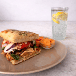 Serve the panini with carrots, hummus, pickle spears, and lemon chia sparkling water.