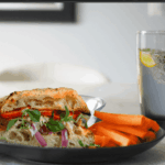 Serve the Frontega chicken panini with carrots and hummus, pickle spears, and lemon chia sparkling water.