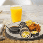 Serve gimbap sushi with kimchi, Korean potato salad, and pineapple orange spritzer.