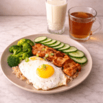 Assemble the bowl by portioning the brown rice and topping with sliced chicken, steamed broccoli, and fried eggs. Garnish with cucumber and scallions if using.