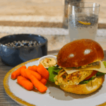 Serve the Greek grilled chicken sandwich with carrots and hummus, blueberries, and the lemon chia sparkling water. Enjoy!