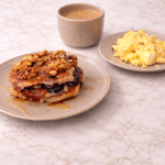 Top the pancakes with chopped walnuts and drizzle with honey.