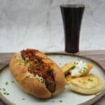 Place the kielbasa on the roll with sauerkraut and saucy onions. Serve with pierogies and sour cream. Garnish with scallions.