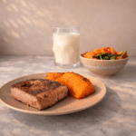 Serve the grilled ribeye with roasted sweet potato, mixed green salad, and milk.