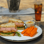 Serve the sandwich with carrots, hummus, pickle spears and hibiscus iced tea.