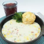 Add the corn, broth, and potato. Season with salt and pepper, then bring to a low simmer, partially covered with a lid for about 30 minutes. Add in the milk and ham, then bring back to a simmer.