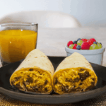 Assemble wraps: Divide the scrambled egg mixture evenly between the wraps and roll.