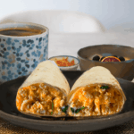 Portion the egg mixture onto the wraps. Fold in the sides and roll up tightly. Cut in half.