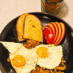Serve the hash browns with eggs, toast (buttered if desired), and apple.