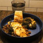 Pour the mixture into an 8 x 8 baking dish (or larger if batch cooking portions). Stick the potato slices in a line on top of the mixture with sliced edges facing somewhat upwards. Continue doing this until the surface of the mixture is covered, using smaller pieces of potato to fill in any gaps. Sprinkle with parmesan cheese over top.