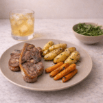 Serve the herb garlic lamb chops with roasted fingerling potatoes, roasted carrots, and arugula salad, and chamomile iced tea.