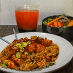 Serve the chicken with fried rice, salad, and kombucha.
