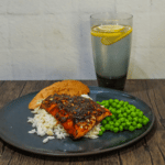 Serve: Enjoy the salmon with rice, peas, bread and butter, and spritzer.