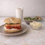 Serve the hot salmon sandwich with the white bean and arugula salad, warm sauerkraut, cinnamon almond milk, and Divine Dish oatmeal banana cookies.