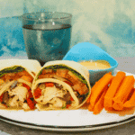 Serve: Cut wrap in half. Enjoy with carrot sticks, chipotle ranch, and sparkling water