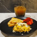 Portion and top with feta; serve with toast and strawberries.
