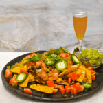 Remove nachos from the oven and top with lettuce, tomato, jalapeño (if using), red onion, sour cream, and guacamole.