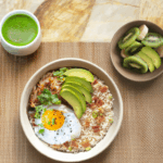 Assemble the kimchi breakfast bowls: Divide rice between bowls. Top with kimchi, fried egg, bacon mushroom mixture, sliced avocado, scallion greens, sesame seeds, and nori if using.