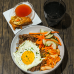 To assemble the bibimbap, divide the cooked rice into two bowls. Top with pickled vegetables, kimchi, and beef. Drizzle with sauce and add a fried egg on top. Garnish with scallions. Enjoy with egg roll, sauce, and sparkling water.