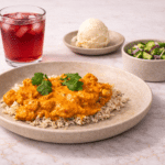 Serve the chicken over rice garnished with chopped cilantro, cucumber salad, hibiscus iced tea and vanilla ice cream.