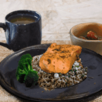 Serve the salmon with lemon herb farro, steamed broccolini, mint tea and dates.