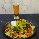 Serve: Remove nachos from the oven and top with lettuce, tomato, jalapeno (if using), onion, sour cream, and guacamole. Enjoy with a cold beer.