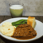 Serve: Plate mashed potatoes and meatloaf. Spoon the gravy over the meatloaf. Enjoy with green beans, bread, and milk.