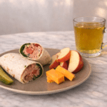 Serve the Mediterranean tuna wraps with sliced apple, cheese, pickle spears, and hot chamomile tea.