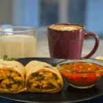 Serve: Serve the burrito with optional salsa, sour cream, hot sauce, fruit, coffee, and milk.