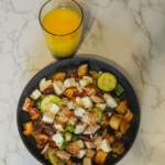 To make the croutons: Preheat the oven broiler on low. Line a baking sheet with parchment paper or foil. Cut the bread into cubes and place them on the baking sheet. Drizzle the cubes with olive oil, season with garlic powder, salt and pepper, and toss until thoroughly combined. Broil until golden brown and crunchy on all sides. Toss occasionally to get an even toasting. Then set aside.