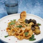 If the sauce needs to be thinned out stir in the reserved pasta water as needed. Once the sauce is creamy adjust the seasoning to taste. Then remove from the heat.