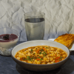 Portion the soup and garnish with parsley and parmesan. Serve with garlic toast, panna cotta, and sparkling water.